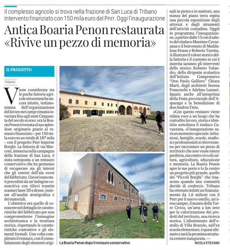 «Con questo restauro viene ridata voce a un luogo che ha custodito lavoro, storia e identità» sottolinea il sindaco Cavazzana, «l’inaugurazione sarà un momento speciale: istituzioni, famiglie, scuole, studiosi e professionisti si ritroveranno per raccontare un pezzo di territorio che non vuole essere periferia, ma centro vivo di cultura, agricoltura, educazione e memoria. La Boaria Penon apre le sue porte e lo fa entro un progetto più grande, quello dei “Piccoli Borghi” che rinascono quando una comunità decide di crederci». Tribano ha ottenuto infatti un finanziamento da 1,6 milioni con il Pnrr per il nuovo ostello, un’area camper, il museo della Torre Civica, un’area a km zero per la valorizzazione dei prodotti del territorio, una ricerca storica. L’allestimento dell’ostello di Villa Brazolo, nell’ex scuola elementare, è quasi ultimato e sarà la prossima struttura a essere inaugurata.